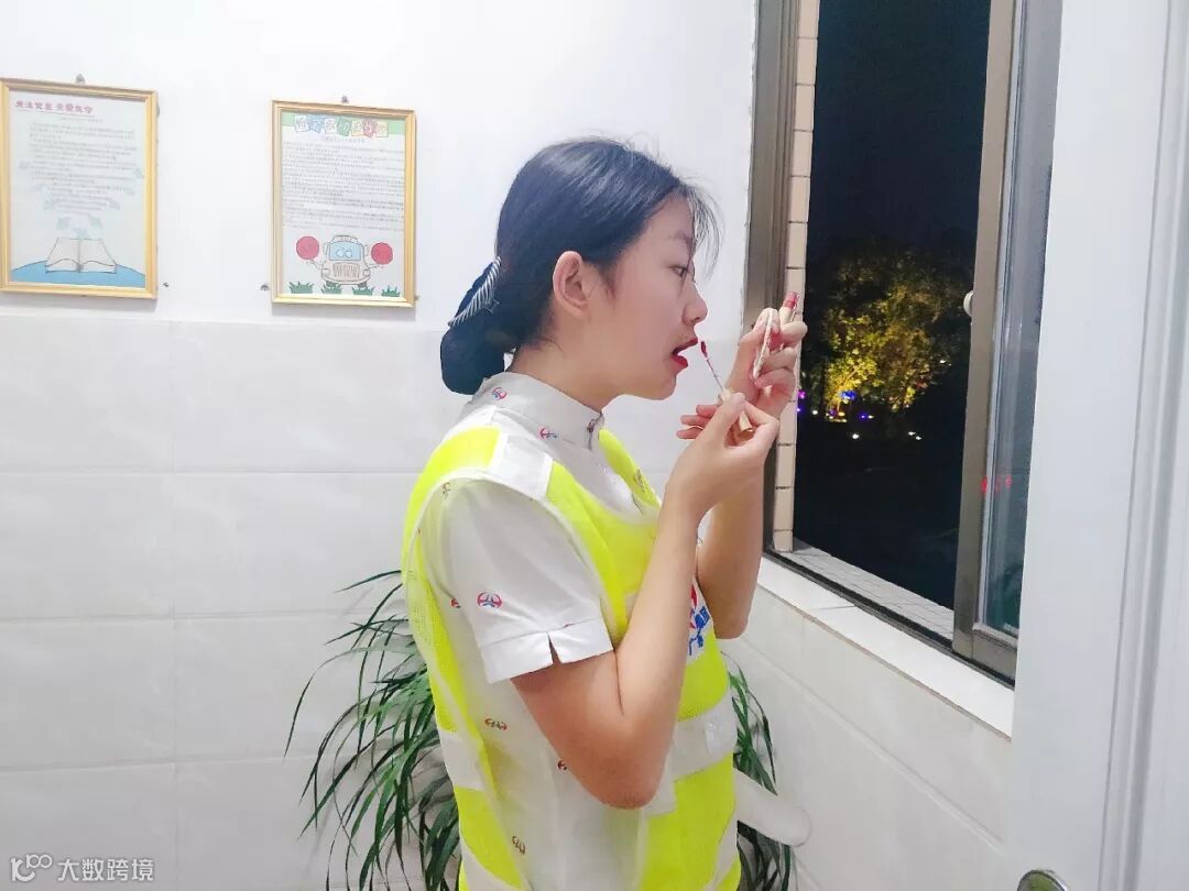 收费员邱菲在补妆