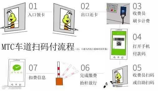 扫码付,即当您驾驶车辆进入收费站MTC车道时,将您在入口领取的高速公路复合卡交收费人员,高速公路收费系统通过读取复合卡内车辆行驶路径,计算通行费金额,传送到移动交易系统。随后您出示付款码,由固定式读码器(用户主动式)或是移动式扫码枪(用户被动式)扫描付款码,收取相应金额后,收费系统向自动栏杆发出抬杆指令,完成交易。