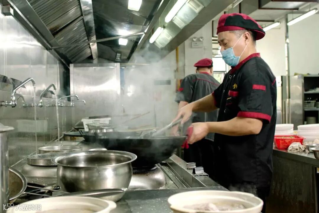 后厨里将近50度的高温,厨师长张波左手握住炒锅,右手拿着勺子,不断地翻炒。一道麻辣炸子鸡还没烧好,他的脸就早被熏红了,头上布满了细密的汗珠。