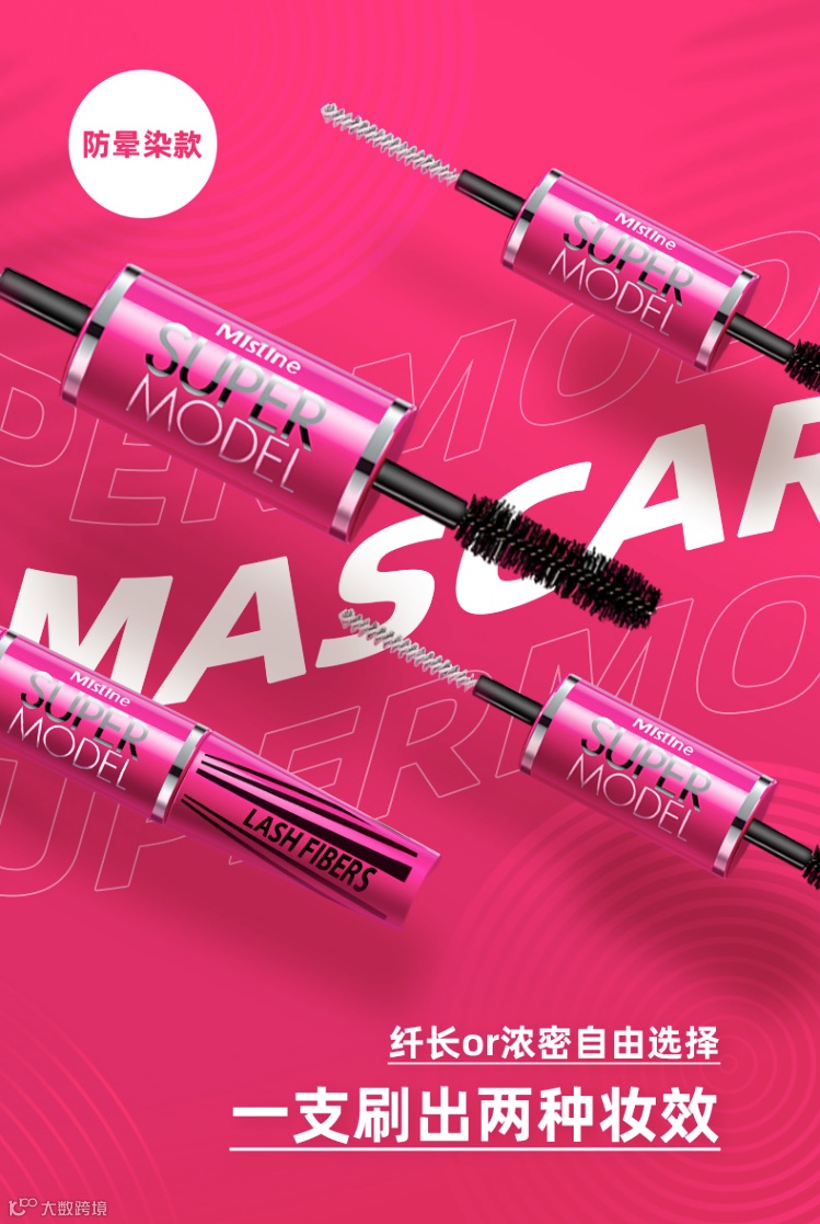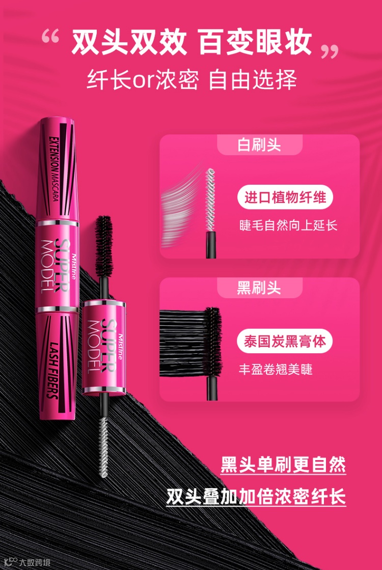 采自日本进口的植物纤维原料,极细黑感粒子,天然提取养护配方。双刷双效,炸出睫毛太阳花。单用黑刷自然纤长卷翘,白刷后叠加黑刷加倍浓密纤长卷翘。
