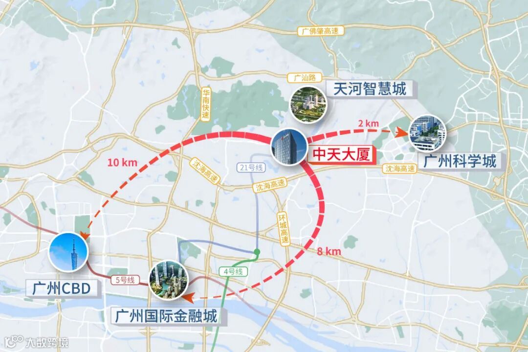 中天大厦位于天河智慧城核心,交通便利。周边2公里内连接多条高速公路,距离广州CBD约10公里车程,步行距离600米可到21号线天河智慧城站。