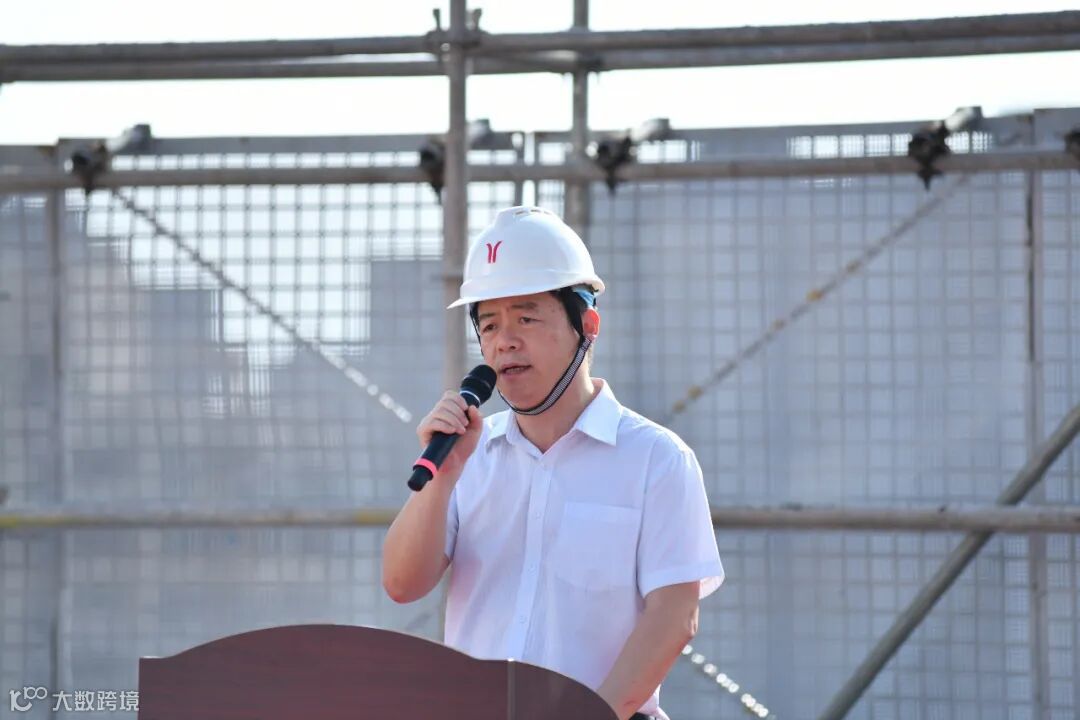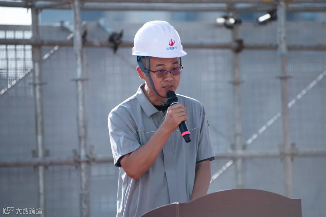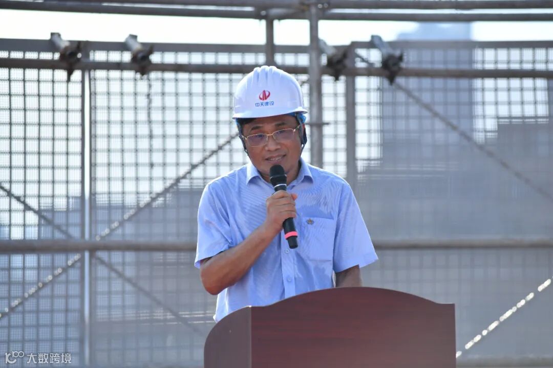 中天华南集团总裁闫新宇代表施工单位发言。闫总介绍:自项目开工以来,面对工期紧张、任务繁重的挑战,我司后台和项目团队协同作战,通过科学统筹、资源整合和顽强拼搏;主动优化施工方案,强化关键节点管控;高效协调资源,保障材料设备及时供应;以超常努力兑现承诺,最终提前36天实现封顶节点!