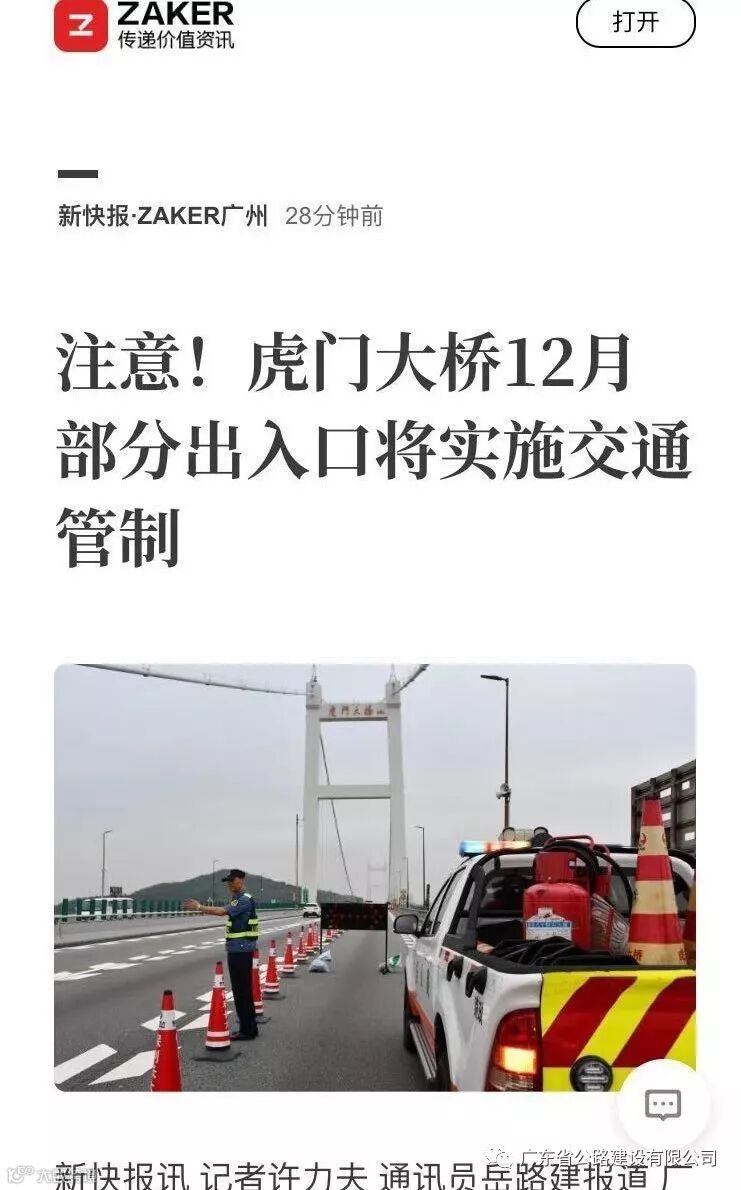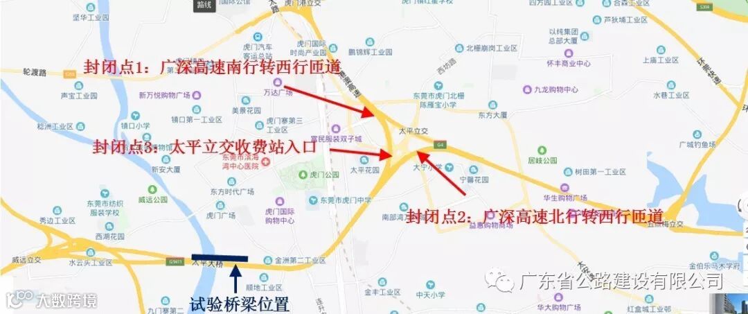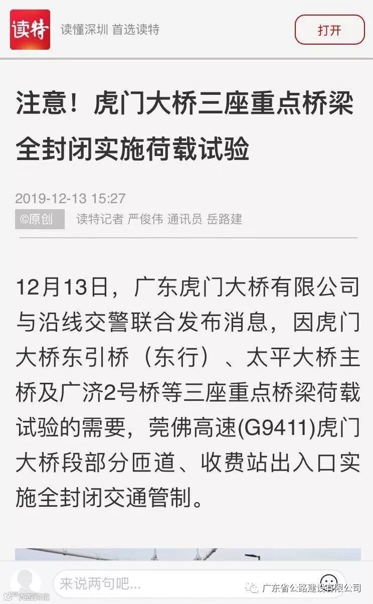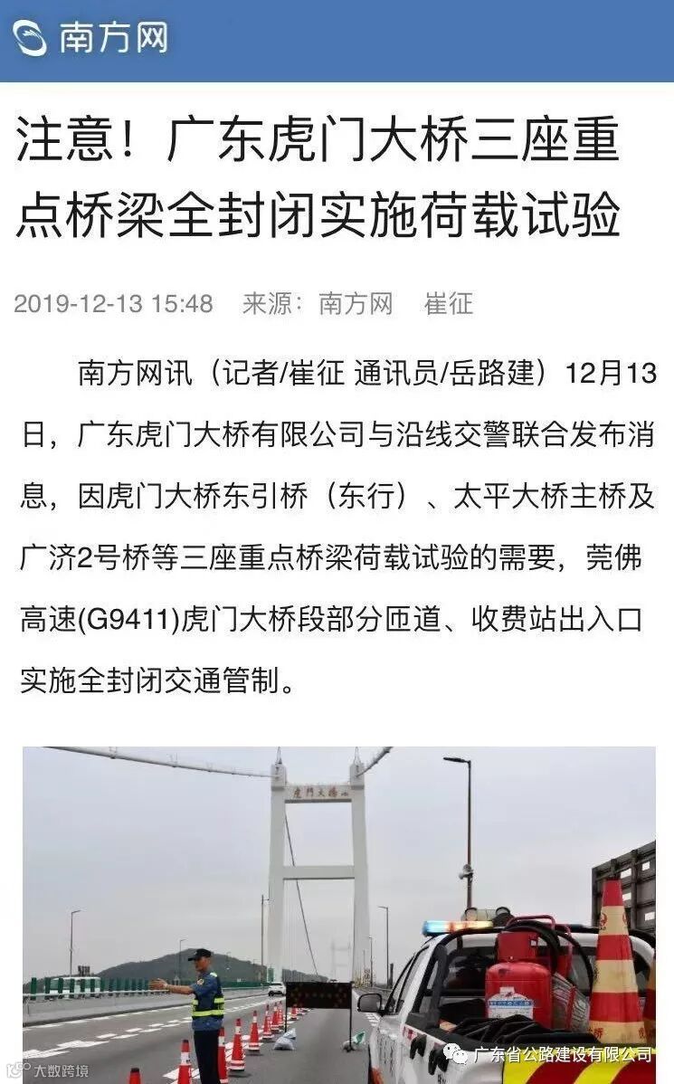 12月13日,虎门大桥公司与沿线交警联合发布消息,因虎门大桥东引桥(东行)、太平大桥主桥及广济2号桥等三座重点桥梁荷载试验的需要,莞佛高速(G9411)虎门大桥段部分匝道、收费站出入口实施全封闭交通管制。