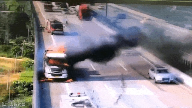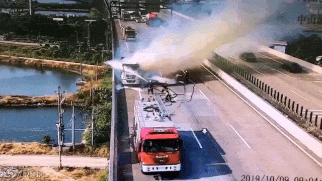 消防人员到场后开始紧张作业,路政人员靠前指挥交通,协助消防人员封闭车道,封锁事故现场,避免二次事故的发生。