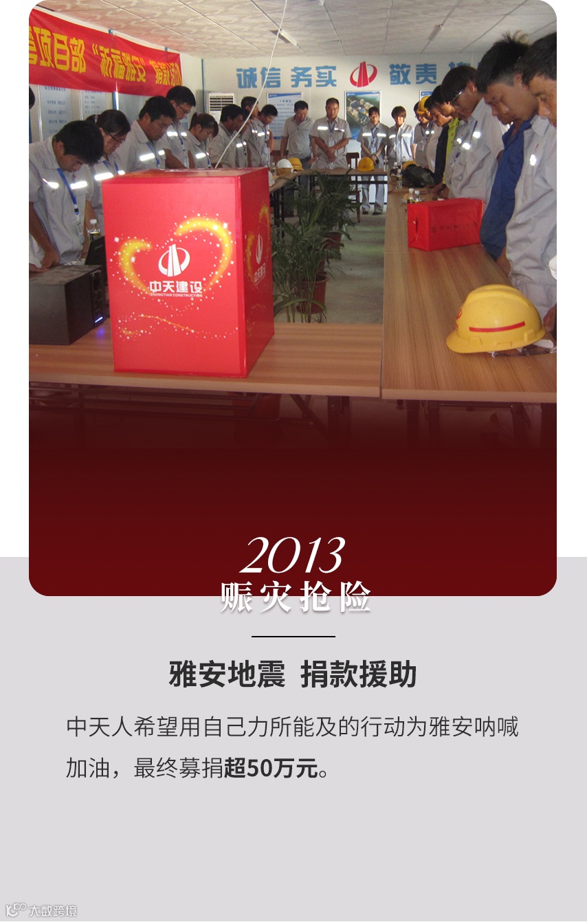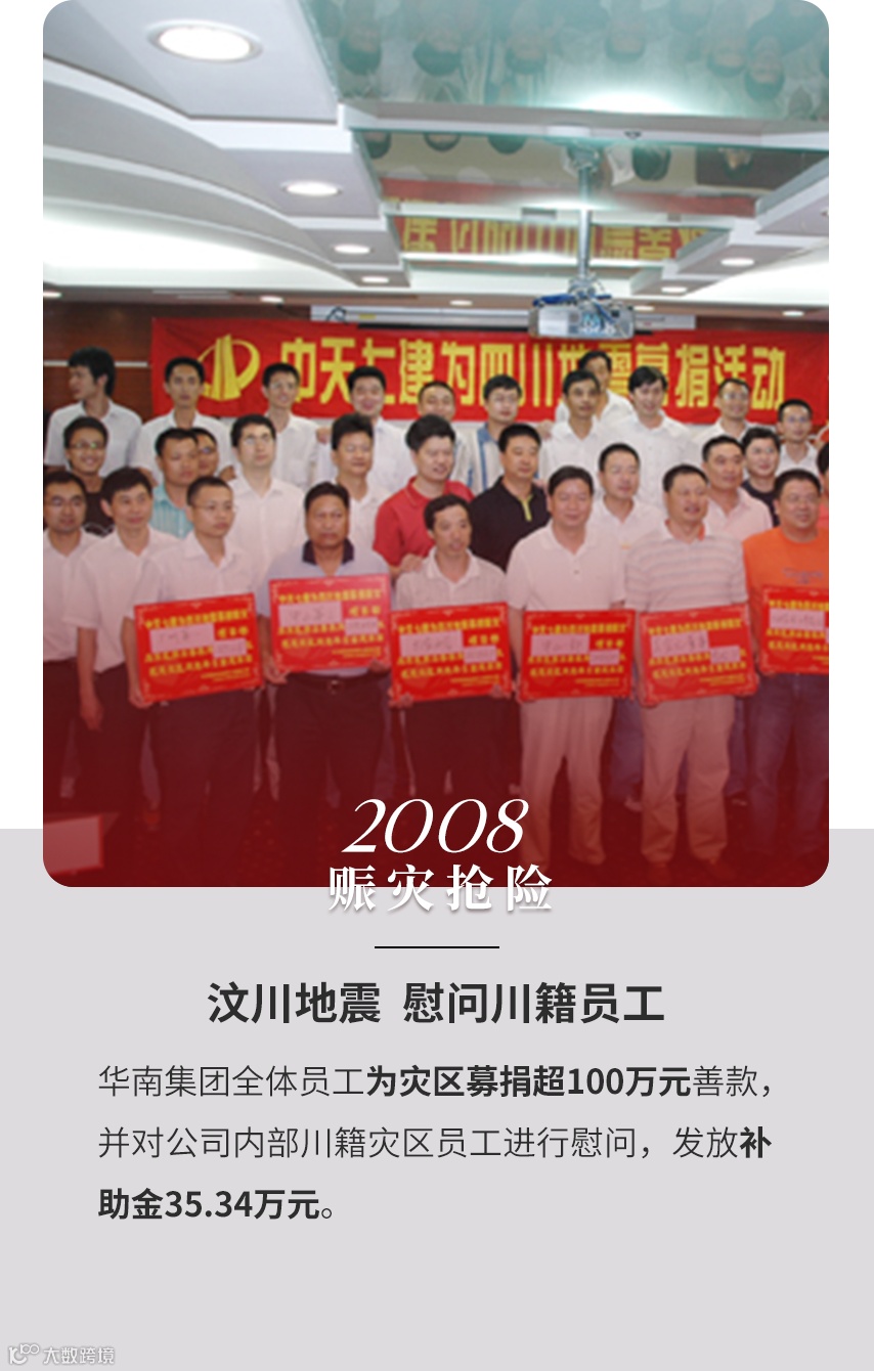 中天人积极投身赈灾公益活动当中,每逢重大灾情出现,中天华南集团全体成员有钱出钱,有力出力,为灾区募捐、慰问受灾人员、援建基础设施,为灾区和灾民献出力所能及的力量。