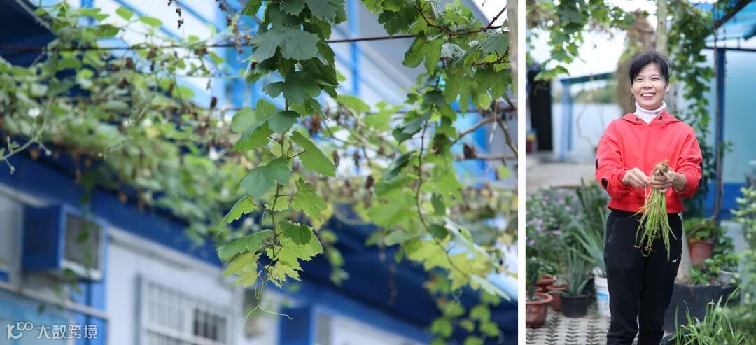 两夫妻种植的各式蔬菜,有攀爬的葫芦、绿油油的青菜、长势喜人的小葱……
