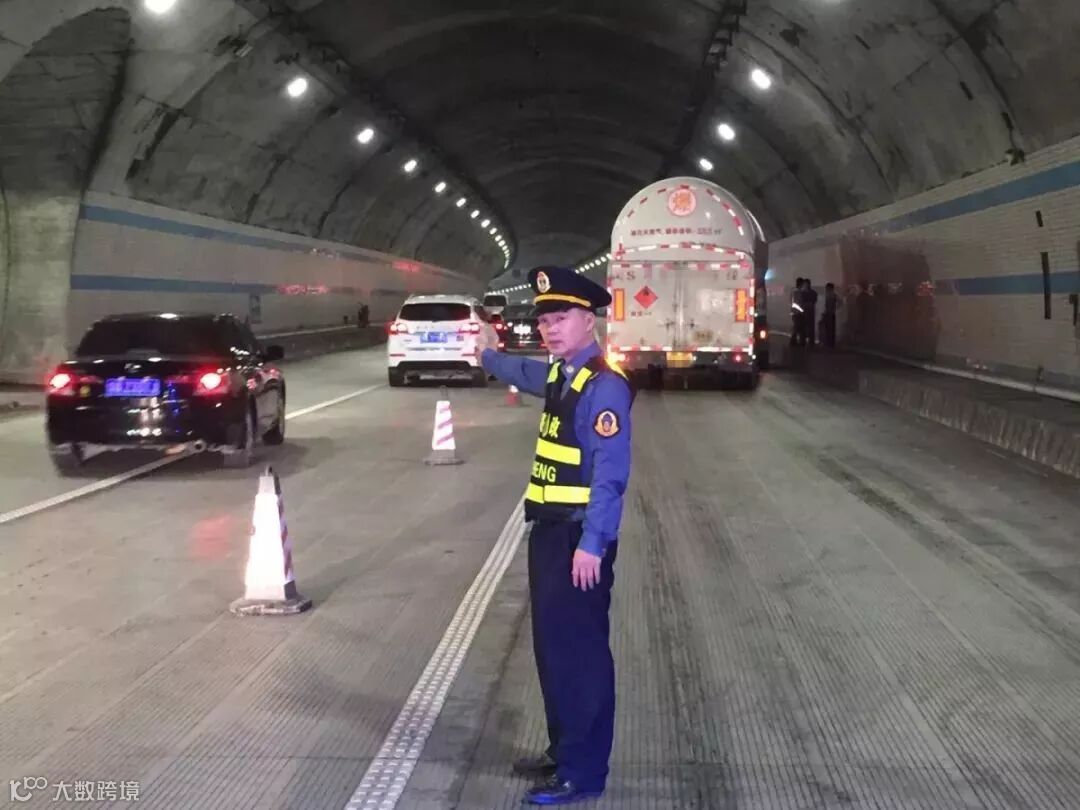 路政人员协同司机检查车辆运载的危化品没有出现泄漏情况后,一方面指引司机下车,站到隧道内的人行道上;另一方面指引现场车辆有序、安全进入隧道。天色慢慢变暗,隧道外视野开始变差,在拯救车辆到达后,路政人员帮助拯救人员快速牵引危化品车辆。