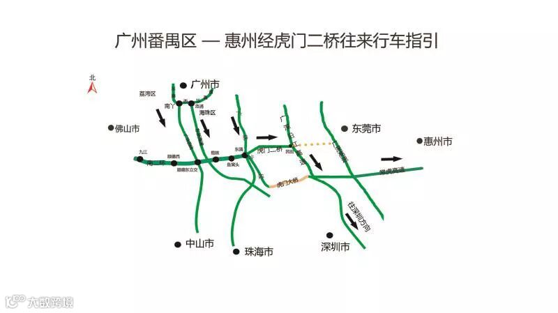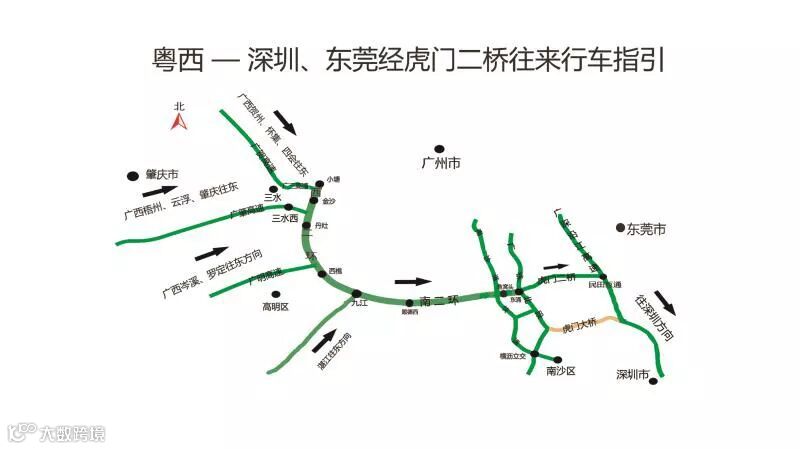 广州番禺区——东莞、深圳市区:广珠西线 / 东新高速 / 广珠北段高速——南二环高速——虎门二桥——广深沿江高速 ——东莞、深圳市区