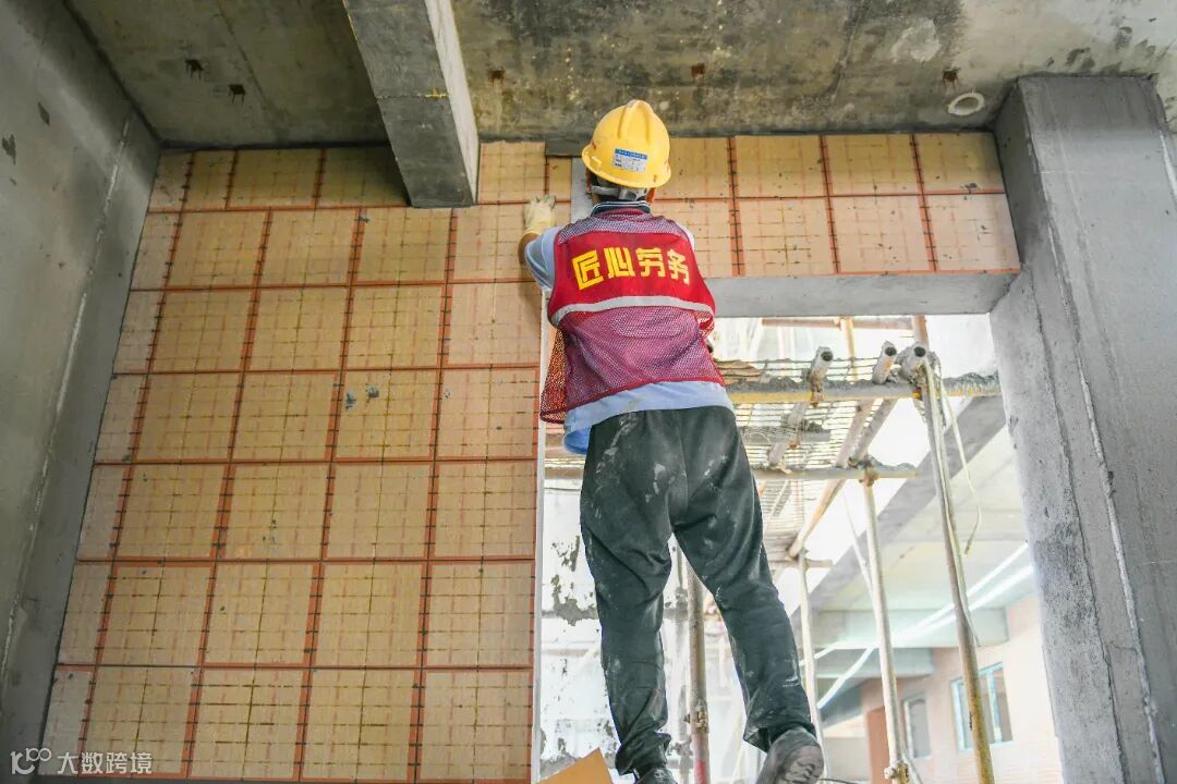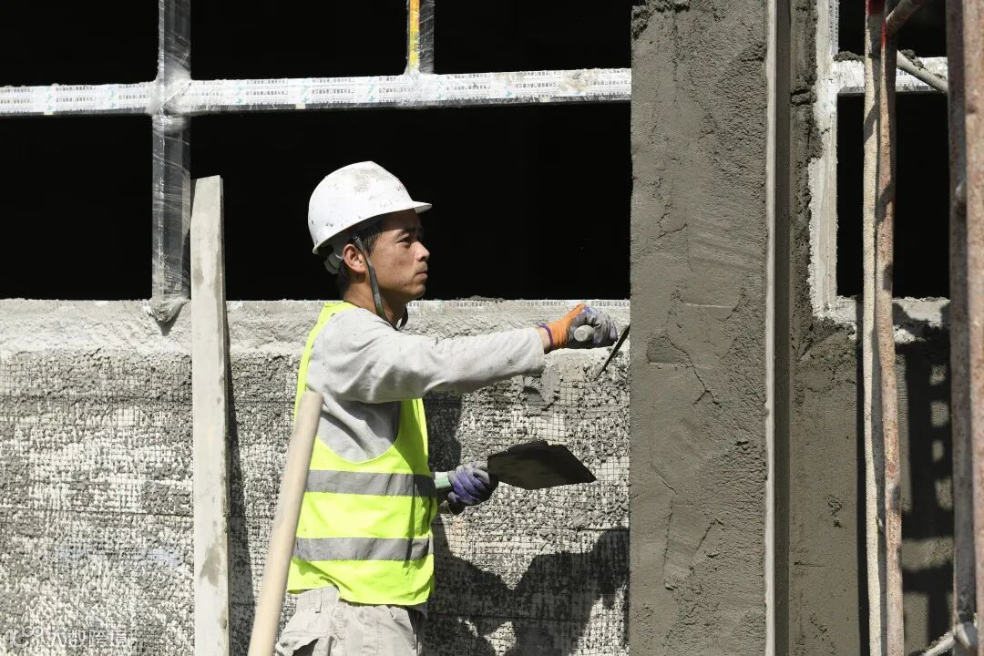 在搭设好安全且必备的防水措施后,墙体抹灰工作一切运转正常!