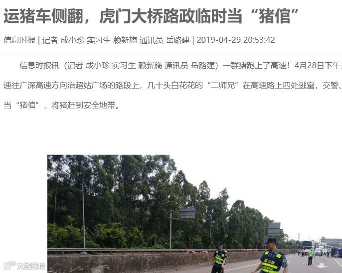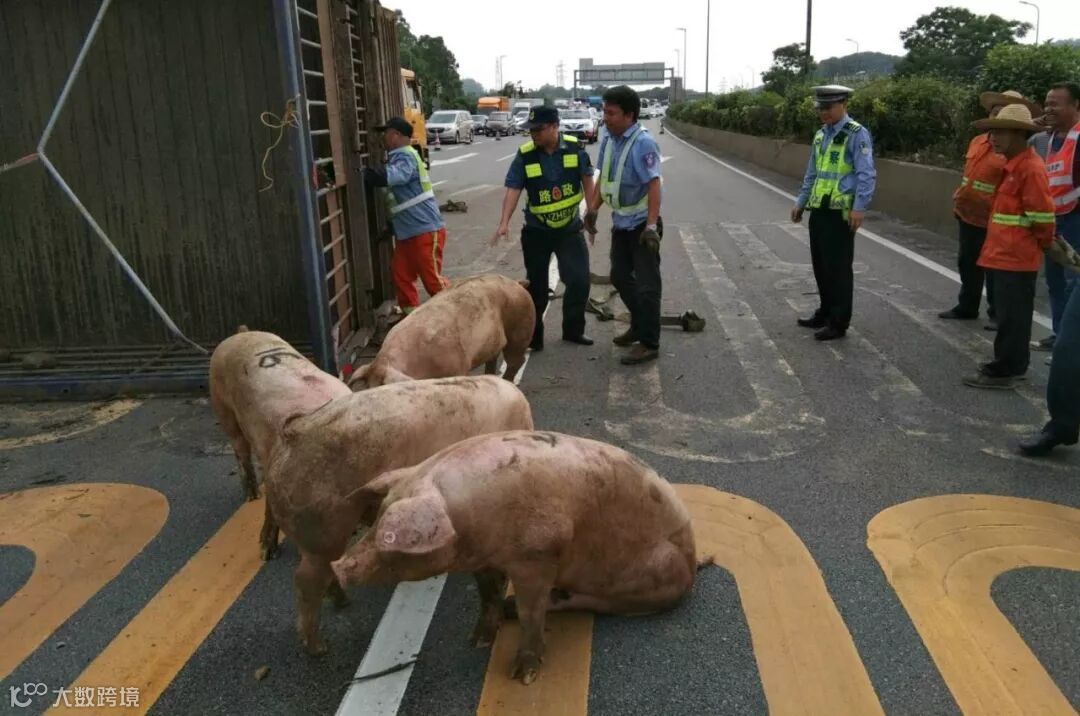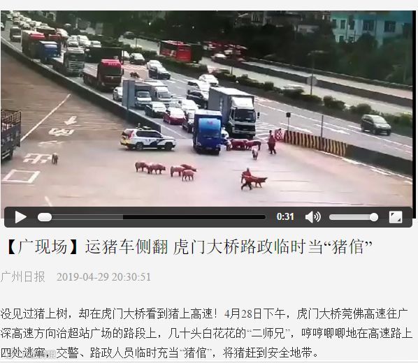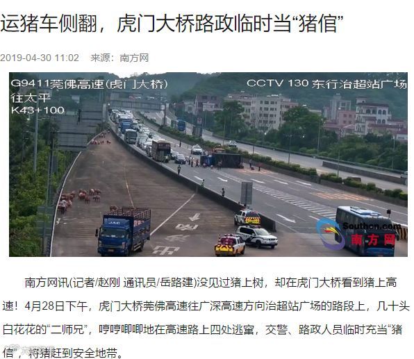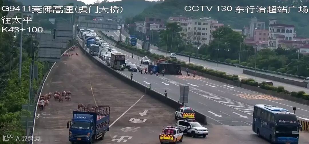 4月28日下午2时58分,虎门大桥莞佛高速往广深高速方向治超站广场的道路上,一辆装载着56头猪的大货车因在驾驶操作中打方向盘太急在行驶途中突然翻车,不仅堵塞了往治超站方向的2条车道,它所装载的几十只猪也都随之倒地。