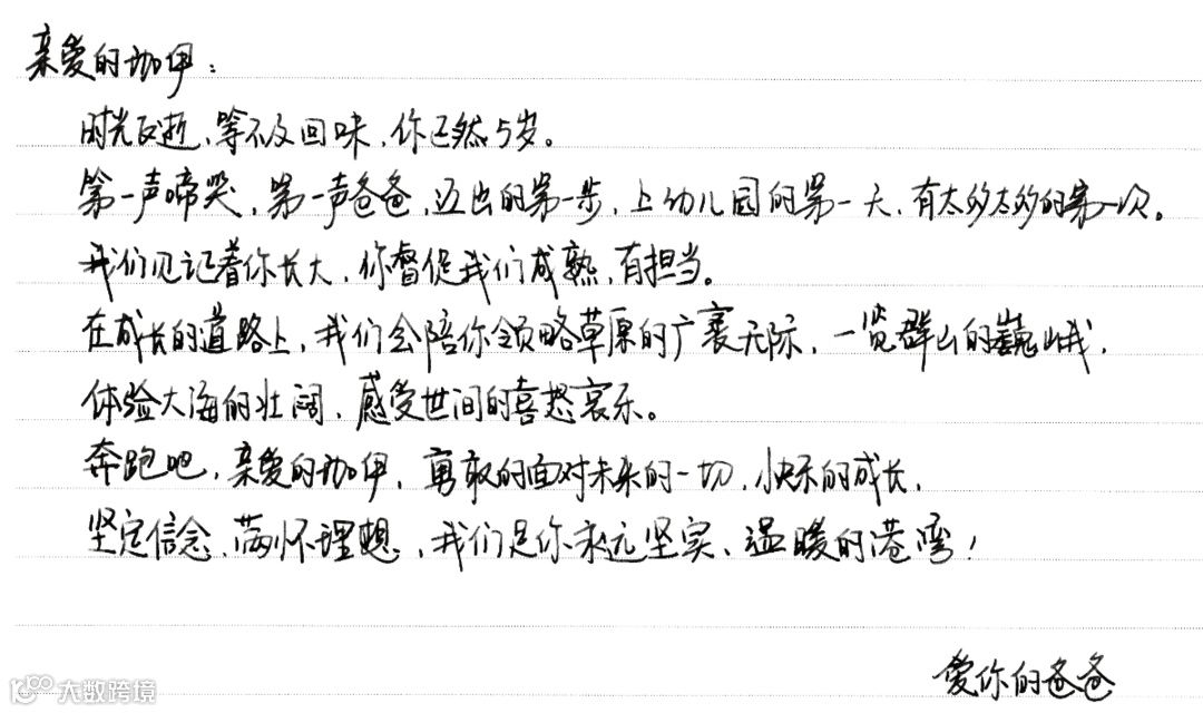 成为父亲后,人变得更柔软了,更谨慎了,更容易紧张了……但内心也变得更强大,拥有了无论发生什么事都要顶硬上的勇气——感谢你的到来。你初来这个世界,我也是第一次做爸爸,愿你能健康快乐成长,今后彼此爱护、相互守望。