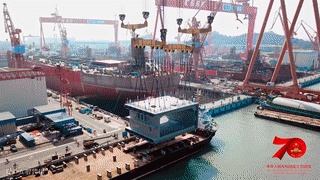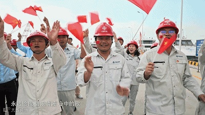 音乐经过编排,将《我和我的祖国》和《咱们工人有力量》选段糅合,劳动者的爱国激情在快闪中绽放。几位建设者代表,登上了深中一号船舶,用最诚挚的歌声,齐唱出这首《咱们工人有力量》。