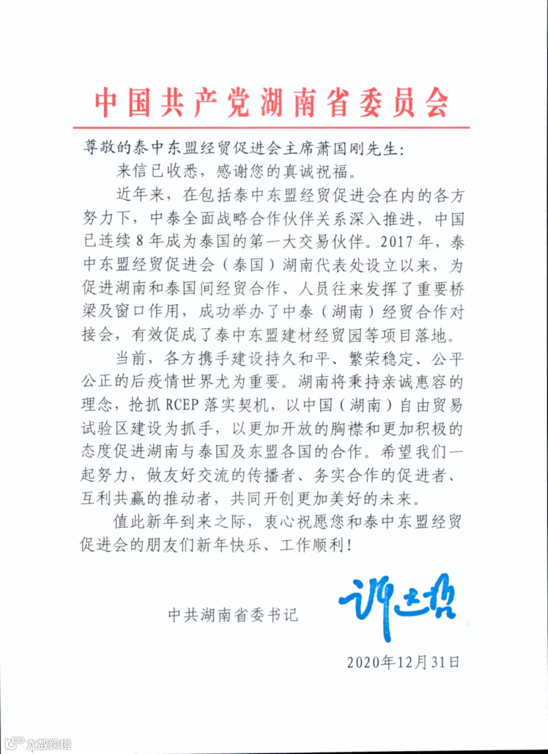 《区域全面经济伙伴关系协定》的签署,泰中东盟经贸促进会望与中国各省建立更多发展和合作机遇。以RCEP协议为桥梁纽带,进一步增进与中国在产业、投资、贸易、文化、旅游等方面合作与交流。