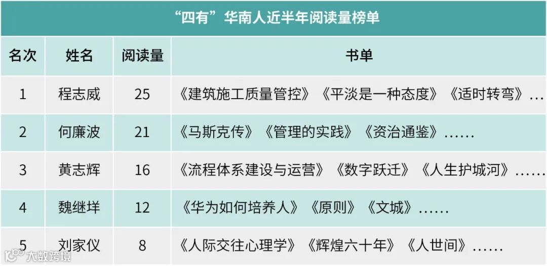 浅阅历代中天华南人用匠心筑就的建筑之书后,是时候展现“四有”华南人的优良传统——“全员学习 终身学习”,以下是近半年阅读量前五的四有员工读书榜单(只统计区域总部员工提交了读书笔记的数据):