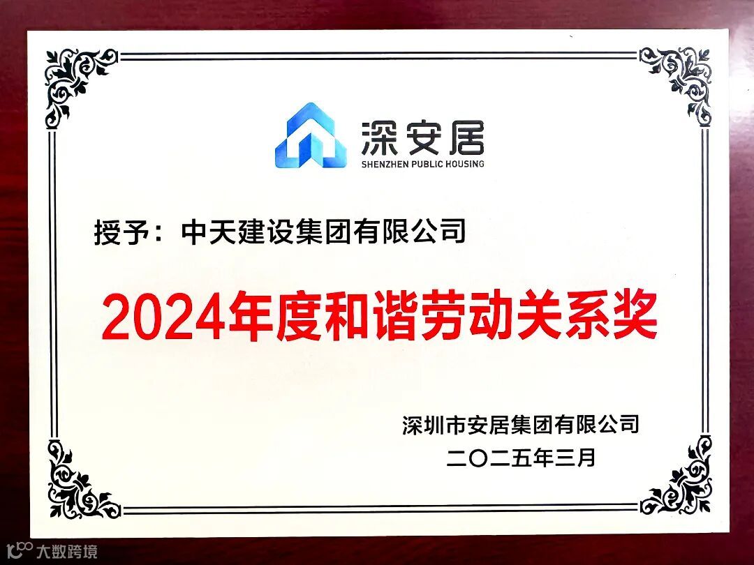 3月14日,深圳市安居集团有限公司召开2024年度建设工程总结暨供应商大会。会上,中天建设集团有限公司凭借在劳动关系管理、施工质量及社会责任践行等方面的突出表现,荣获安居集团“2024年度和谐劳动关系奖”。深圳市安居集团党委副书记、总经理唐绍杰,副总经理李东宁、周柏新等领导出席会议,中天华南集团深圳分公司总经理尹伟贤率项目团队代表参会并领奖。