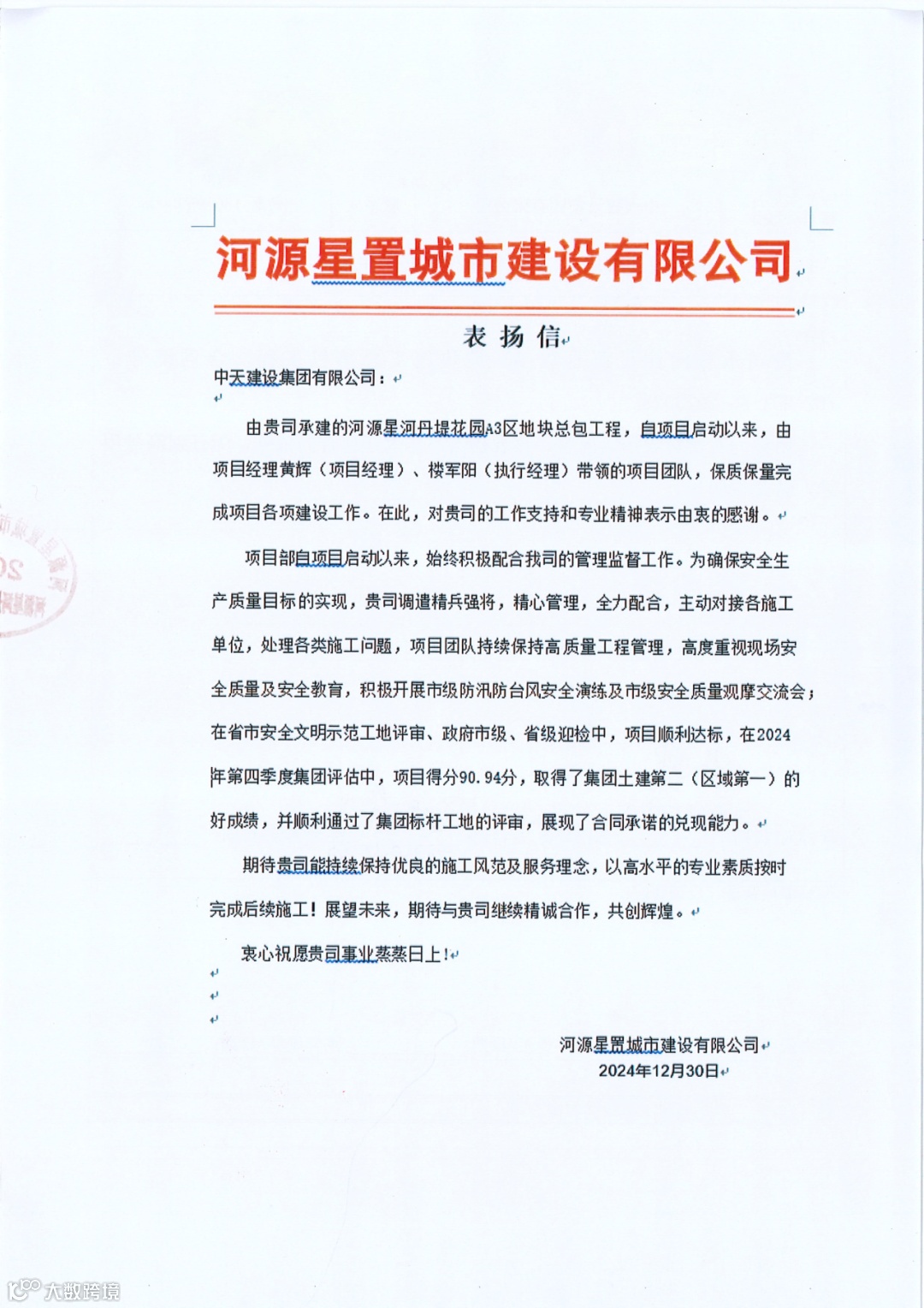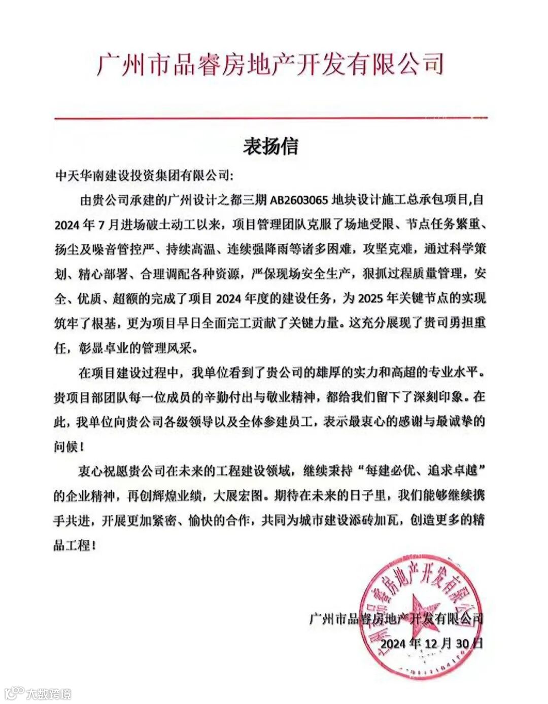 2024年12月30日,广州市品睿房地产开发有限公司(广州地铁集团有限公司)向我们发来表扬信。信中提及,自2024年7月开工以来,广州设计之都三期项目在华南集团项目管理团队的精心策划、周密部署和高效资源调配下,面对场地受限、任务繁重等多重挑战,不仅确保了现场安全生产,还超额完成了年度建设任务,为项目的后续推进奠定了坚实基础。广州地铁对华南集团全体参建员工的敬业精神和高水平专业素养表示由衷的敬意。