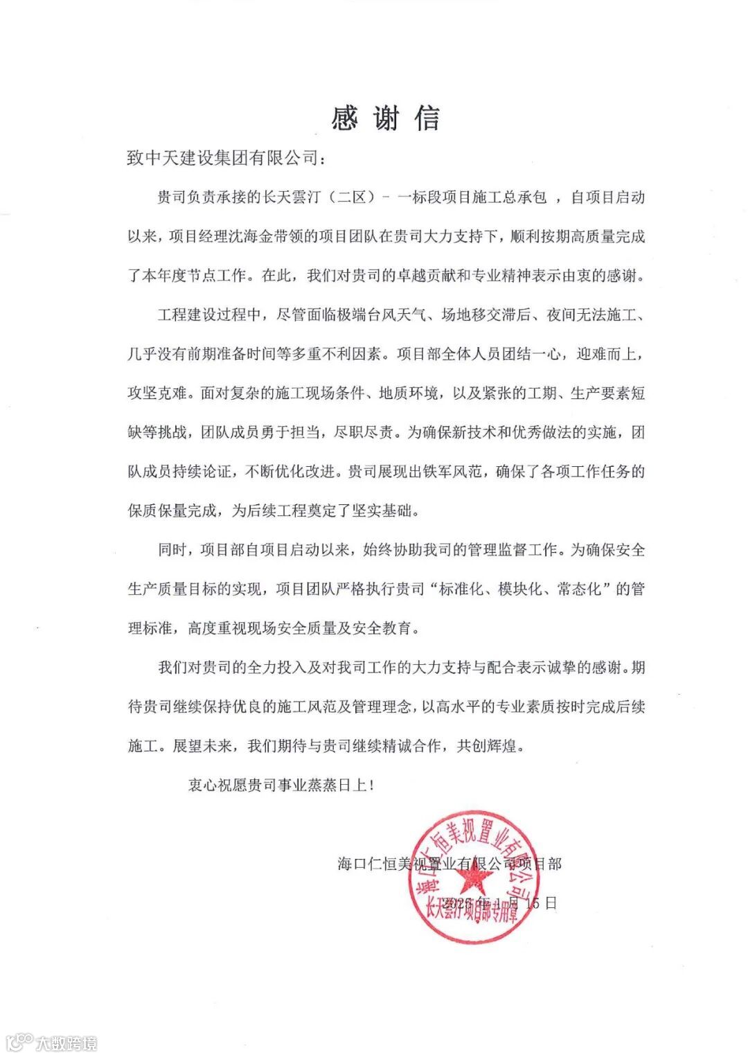 此外,广州越秀星汇锦城项目、深圳信城缙熙园主体项目、河源星河丹堤花园A3区项目以及海口仁恒美视长天云汀二期一标段工程项目等也先后收到了业主方的表扬信。这些荣誉,是对华南集团每一个项目团队辛勤付出的最好肯定,也是我们继续前行的强大动力。