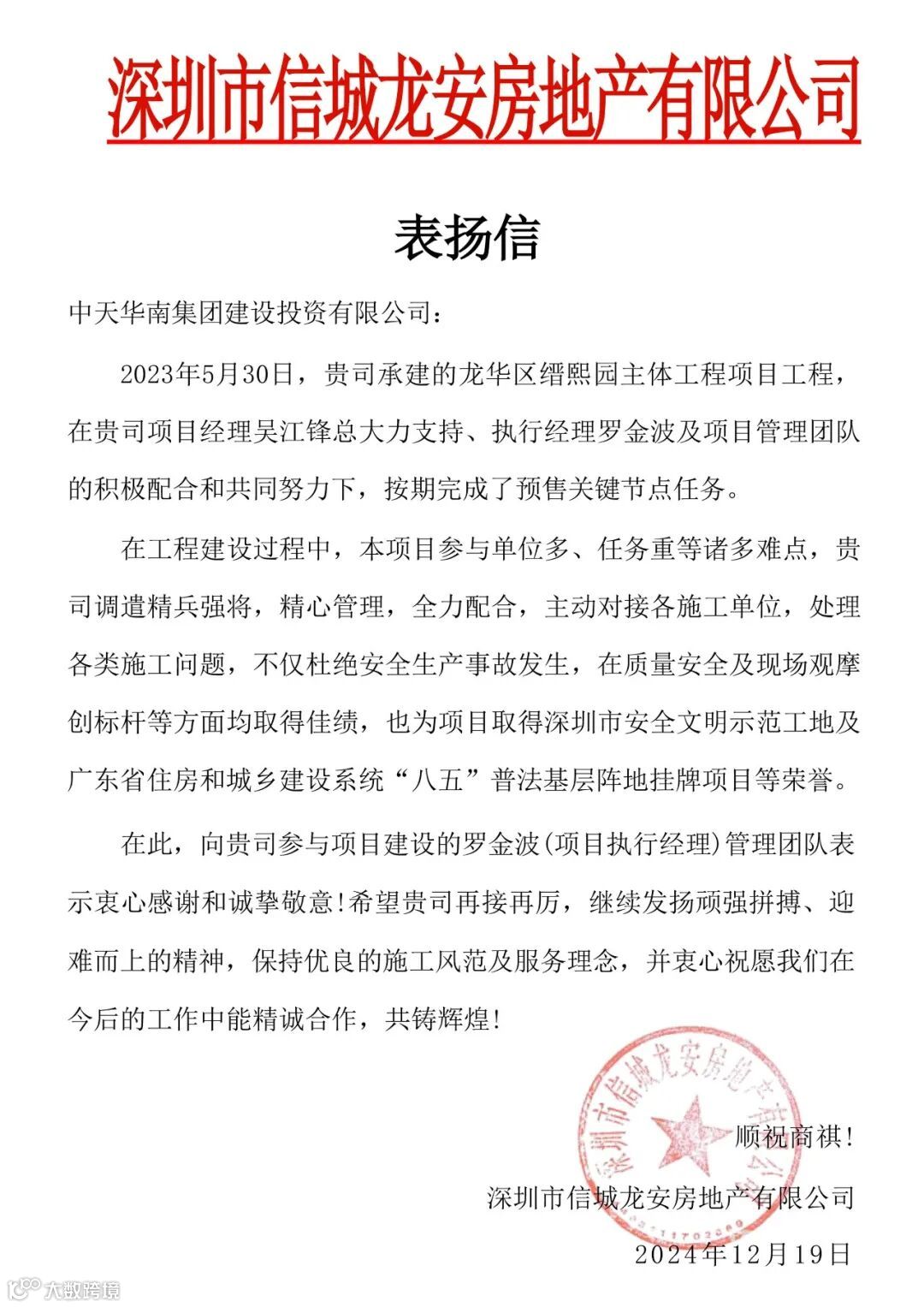 同样在2024年12月30日,深圳市罗湖安居有限公司向我们发来表扬信。信中高度肯定了深圳中学项目(西地块)在噪声、扬尘污染防治方面的卓越表现,该项目荣获了深圳市生态环境局罗湖管理局颁发的第一批罗湖区建设工程施工噪声、扬尘污染防治合规建设“示范项目”奖项。此外,深圳中学项目(东地块)也获得了业主的表扬信。这些荣誉不仅彰显了华南集团在环保施工领域的领先地位,也体现了我们对社会责任的积极担当。