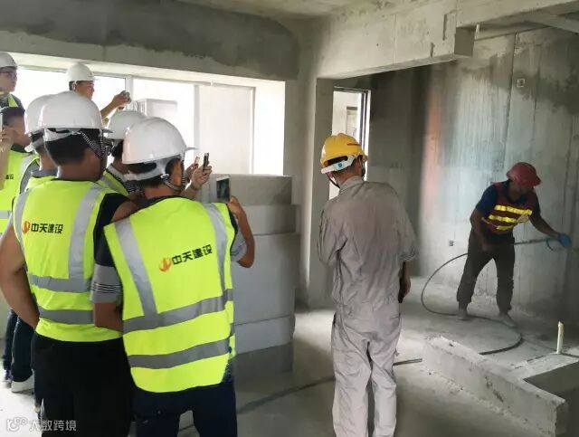 观摩中,与会人员深入了解了中天七建在碧桂园SSGF新建造技术体系推进过程中的应用与深化。 SSGF新建造技术成套工法体系,由碧桂园集团于2017年初创建并推行,作为由主体与精装穿插、地下室装修穿插、市政园林穿插组成的三维穿插施工管理体系,力求从根本上解决房子渗漏、开裂等建筑质量通病,并将施工现场打造成像花园一样的工地。这套体系是十多项新技术的集成,囊括了自愈合防水、爬架、铝模、全现浇外墙、高精度地面、全穿插施工、高压水枪拉毛等一系列工法。