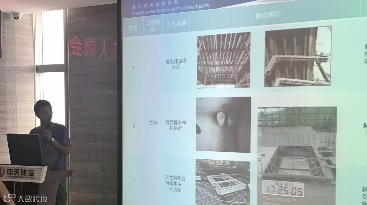 海南分公司三亚齐瓦颂技术负责李阳锋则进行《齐瓦颂项目新工艺、新技术应用》的主题分享,对项目采用的卫生间坎台钢模体系一次成型、同层排水构件保护以及砼预制块模具等十多项新工艺进行了讲解,并对项目施行的穿插施工技术对缩短工期的优势进行了分析。