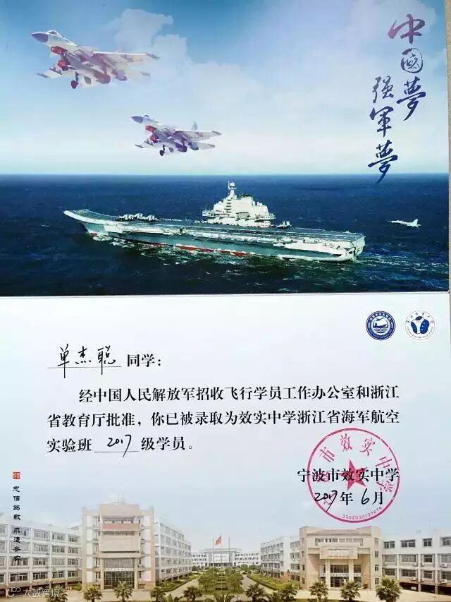 中天七建项目经理单永波的孩子单杰聪童鞋被浙江省首个海军航空实验班(宁波效实中学)提前录取啦!