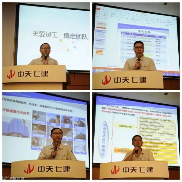 七建总经理助理陈稳德首先带领全体人员合唱司歌,并阐述了会议主题和“四大安全管理提问”,指出安全生产管理功在日常,重在防范;随后,中建五局项目经理王慎介绍了“对全穿插的施工理解”、“总包管理服务及履约”、“新体系中的技术准备”、“新体系中的项目内控”及“新体系中的亮点打造”;东莞万科副总经理汪船灯围绕“如何选择优秀合作伙伴”、“如何建立信任”、“重视能力提升”、“新型社会的个体新要求”、“新型生态下的心态调整”展开了阐述,汪总从客户和观察者角度提出的观点为我们带来了新启发、新思路。