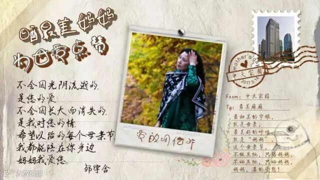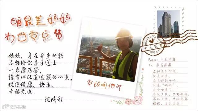 感谢您的付出,培养出如此优秀的员工。感谢您的支持,七建员工才能安心拼搏。请您放心,在中天这个大家庭中,员工的成长与幸福始终是我们关注的重点。在这个属于您的节日里,谨献上最真切的祝福,祝您母亲节快乐。