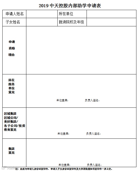符合资助条件的员工填写《2019中天控股助学申请表》,由所在部门/项目部负责人审核签字后报中天华南集团相应联系人,中天控股集团批准后发放助学金。