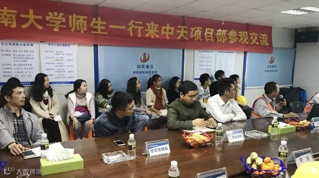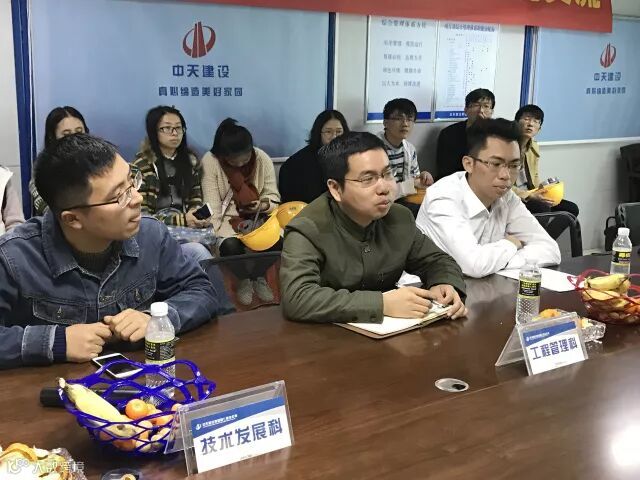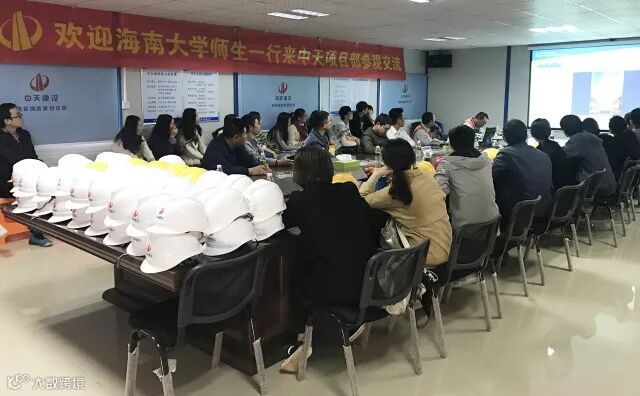 参观完毕,大家在项目部会议室进行交流座谈。分公司鲁媛媛向师生介绍了中天项目部发展通道和机关发展通道两条人才发展渠道。她提到,每年都有许多大学生加入中天,其中有不少优秀大学生已经走上公司中层领导和技术型管理骨干岗位,他们为公司的发展不断努力,做出了突出的贡献。她代表分公司向海南大学学生发出邀请,期待他们能加入中天。作为中天内部成长起来的主管,技术发展科副主任陈军鹏现身说法,与同学们分享了自己从一线施工现场再到机关任职的工作感悟,他肯定了中天的大平台,也鼓励大家要有一个清晰的自我认识和定位,要做好吃苦耐劳的准备,勤奋好学,提升自我。