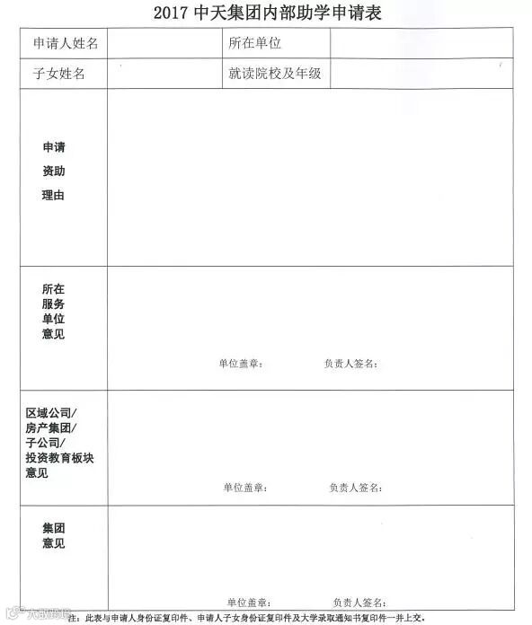 符合资助条件的员工提出书面申请,填写《2017中天集团内部助学申请表》(在公众号中回复“申请表”即可下载),所在项目部负责人审核签字后报中天七建区域/分公司办公室。