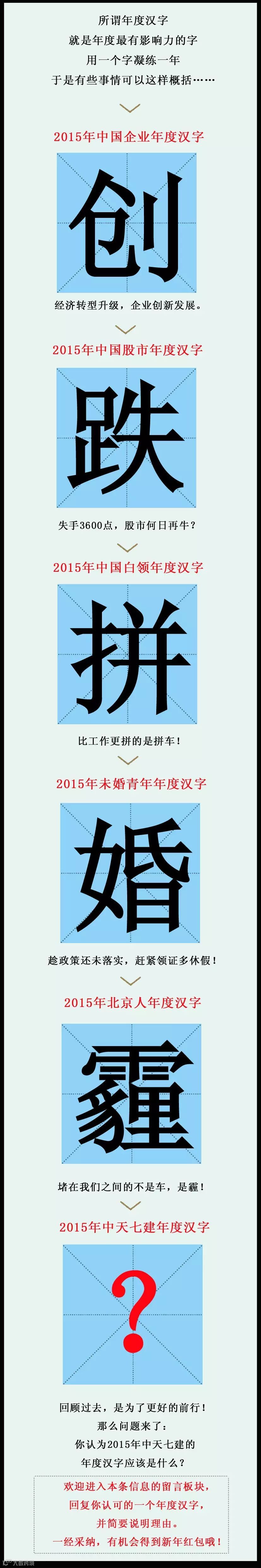 回顾过去,是为了更好的前行!在这辞旧迎新之际,我们诚挚的邀请您一起探讨2015年中天七建的年度汉字,一经采纳,有新年红包相送哦!