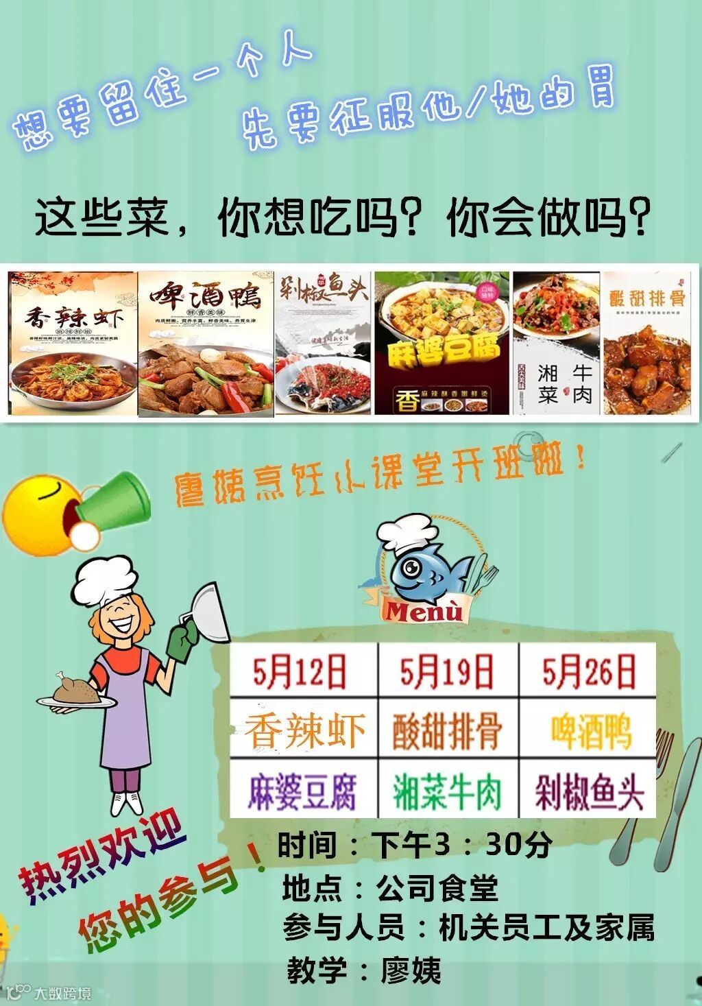 5月12日下午,廖姨烹饪教学班第一期正式开课了,这次的教学课程是:“香辣虾和麻婆豆腐”。