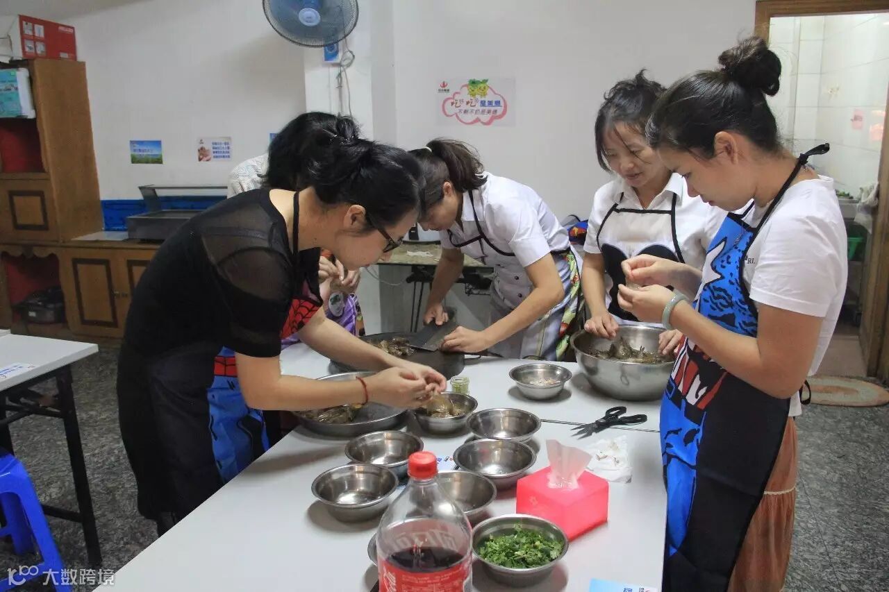 (每道菜下锅之前,要经过一系列的加工程序。学员们按照廖姨的方法,很认真地将虾线挑出来。)