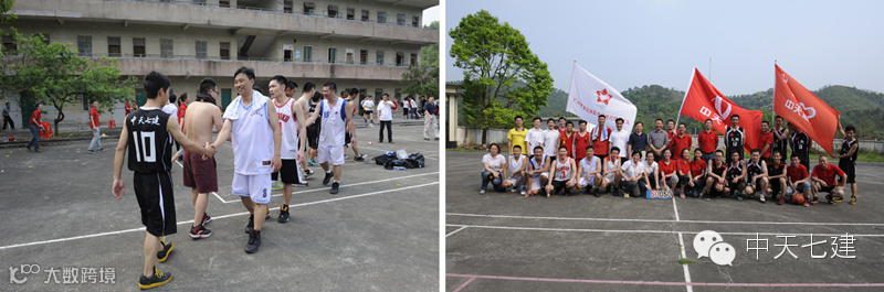 4月18日下午3点20分,随着裁判的一声哨响,广州市政法委与中天七建的篮球友谊赛结束,比分也是就此定格在50:50这个吉利的数字上!赛后,双方球员与教练也是以山心村背后的美丽大山为背景一起合影留恋,将这份深厚友谊永久的保存下来!