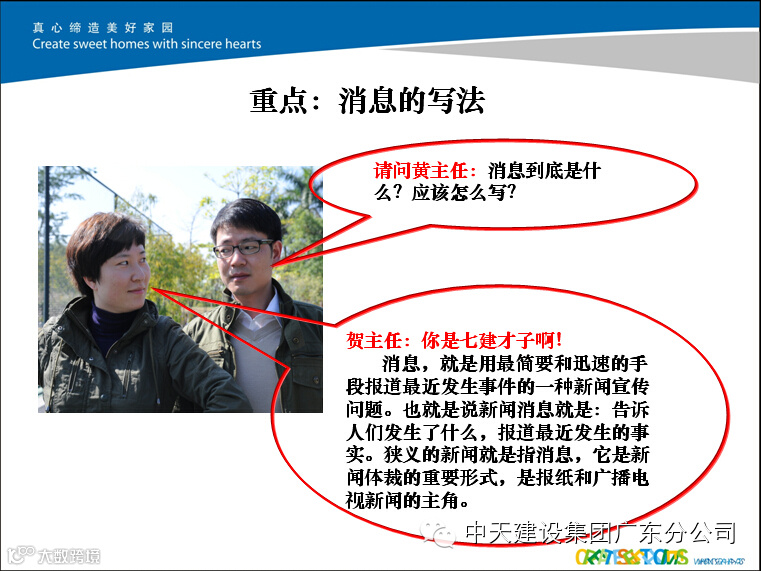 本次分享会共分为通讯报道培训、摄影培训以及读书分享会三个板块。第一板块是通讯写作报道。首先,黄主任把关于宣传报道工作的撰写类型、基本组成要素和具体操作及注意点给参训人员做了细致的讲述,为参训人员解读了通讯报道和信息中的语言要求,尤其是平时的“实战”经验进行了学习、交流,并在每一个部分都结合了社会新闻、公司内部新闻的实例全面仔细地给大家做了分析。
