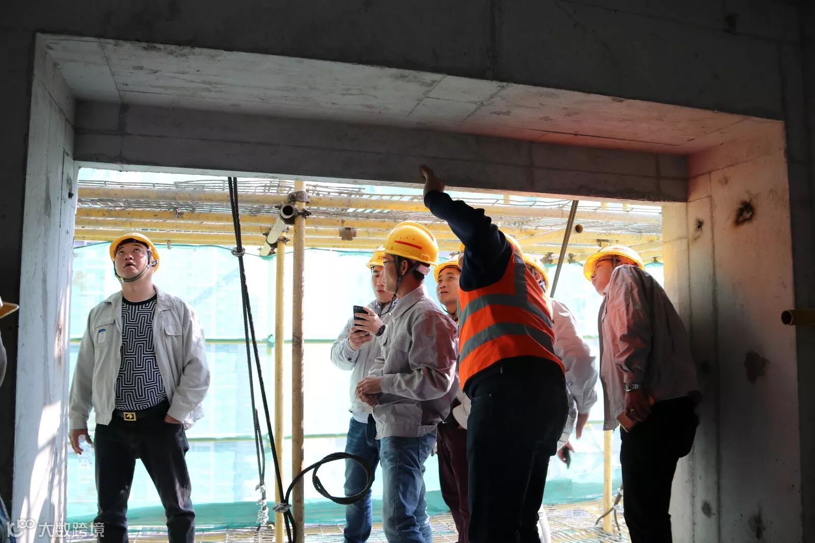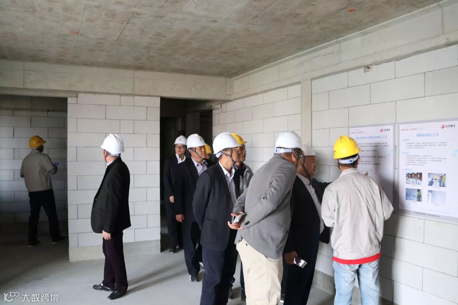 与会人员首先观摩了时代水岸尚苑项目部,实地了解项目部主体结构优化、高精地坪施工、水电明装、高压水枪结构拉毛、高精砌筑、“L”型拉结片等优秀做法。