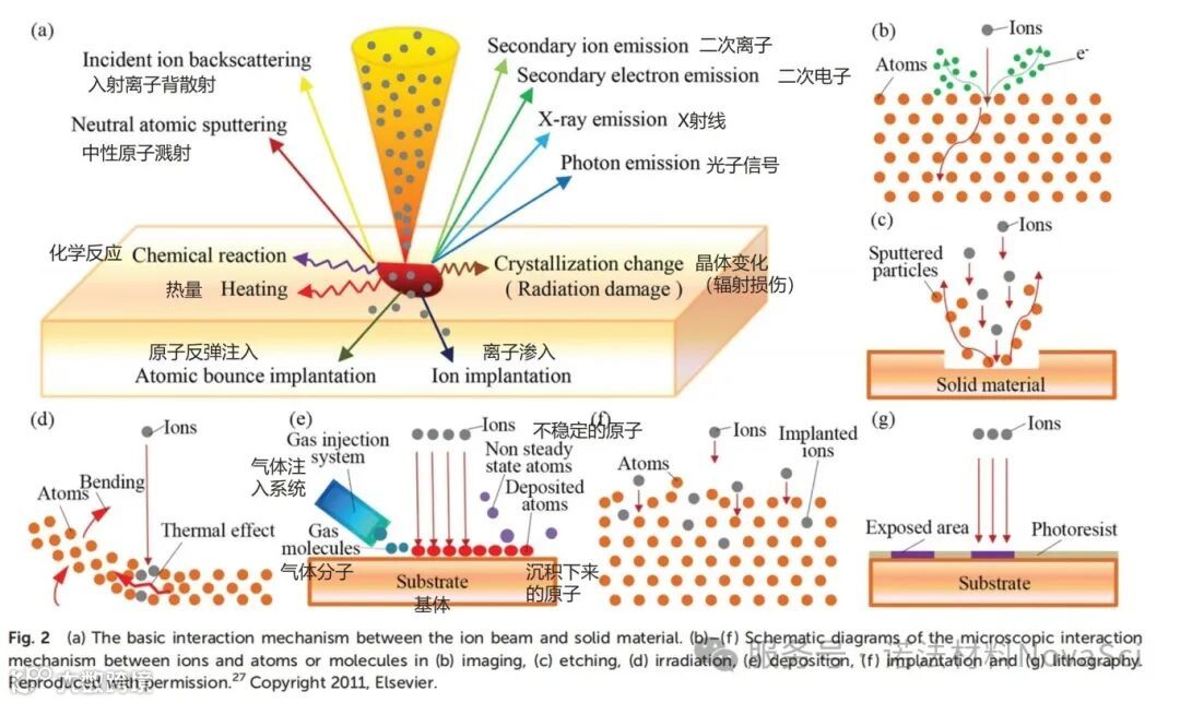 ▲ 图1。(a)离子和固体材料之间的基本相互作用。(b)-(f)是离子和原子或分子之间在微观下发生相互作用的示意图:(b离子成像;(c)离子刻蚀;(d)辐照;(e)气体沉积材料;(f)离子渗入;;(g)离子曝光[1]。