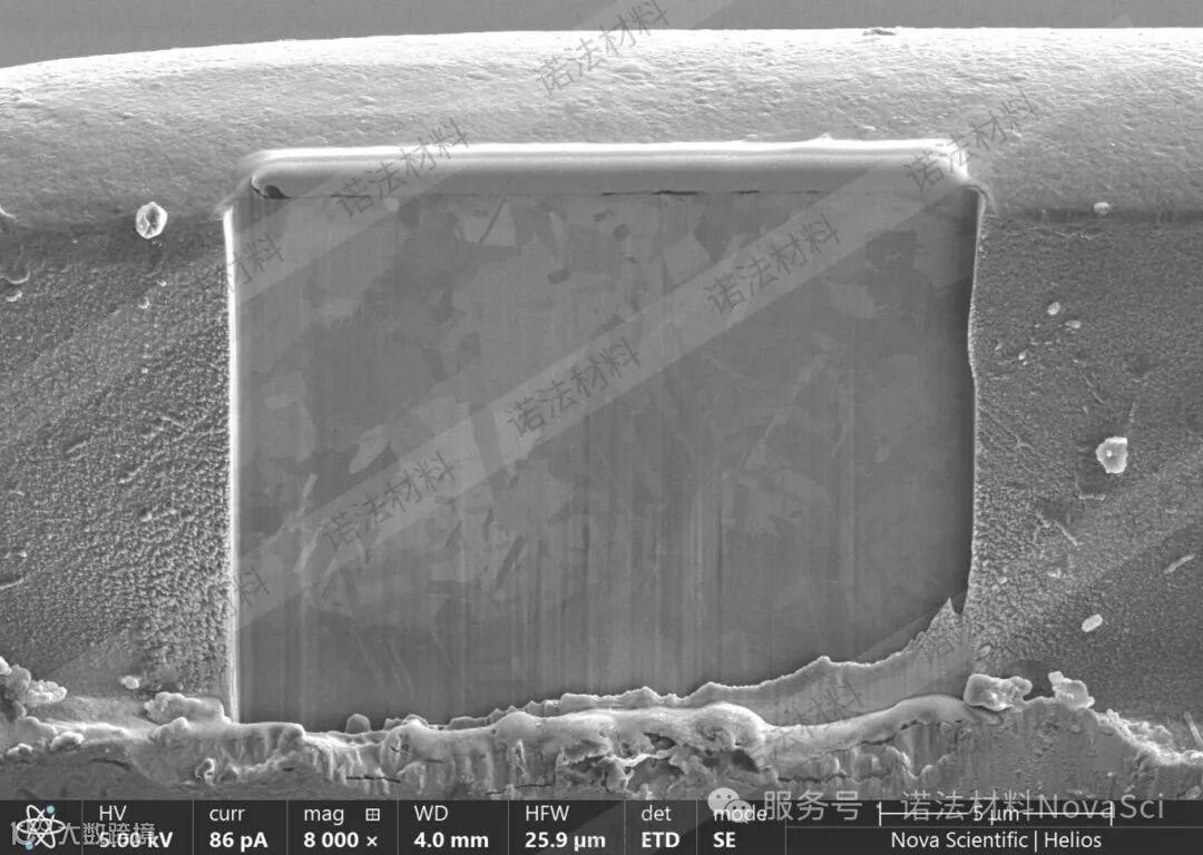 在很多情况下,使用FIB切出材料样品的截面,容易出现“窗帘效应Curtain Effect”(如下图截面的下半部分)。在切割位置的表面沉积保护层,有助于缓解这一问题,使截面更加平滑,便于观察截面的微观结构。