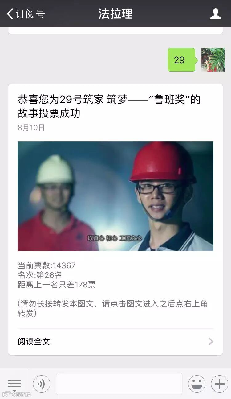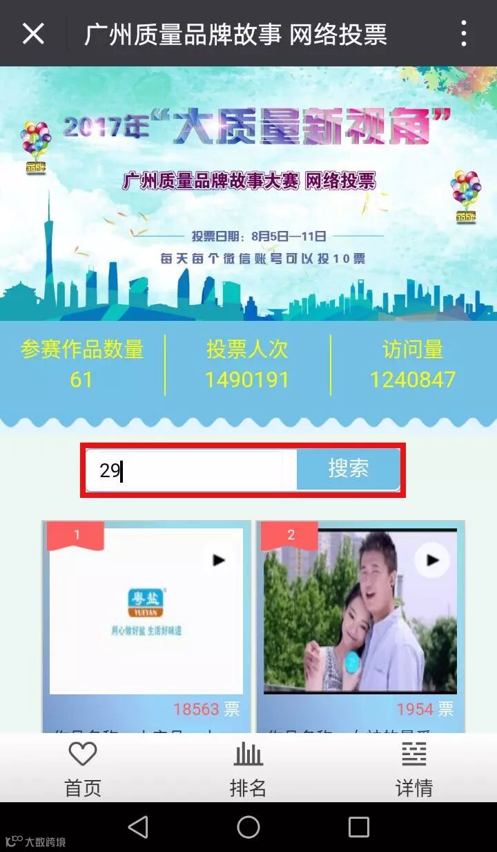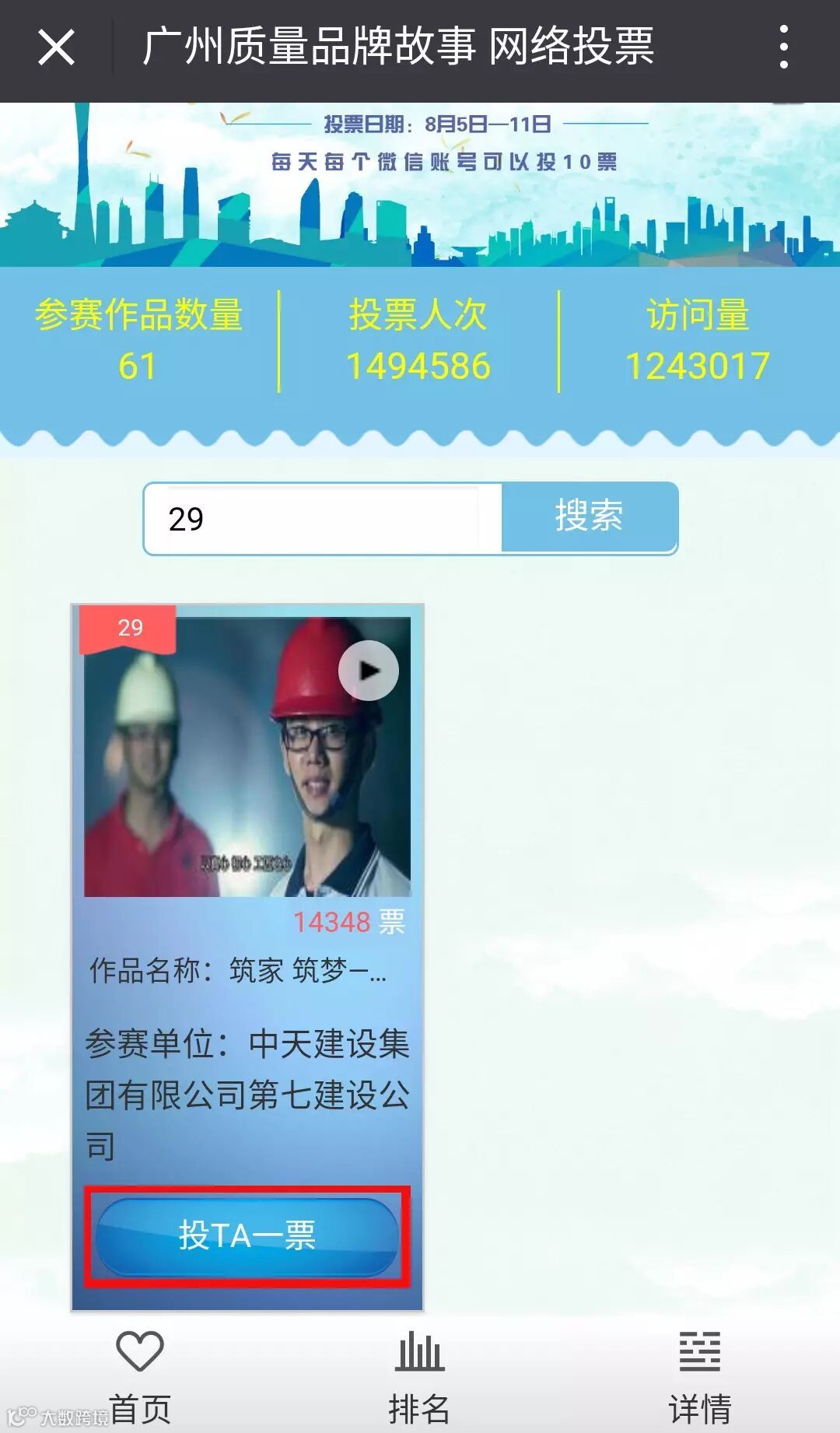 在搜索栏输入编号“29”,进入中天七建品牌故事片《筑梦 筑家——鲁班奖的故事》的投票界面。