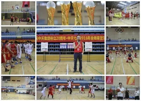 2016年8-11月,为喜迎集团创立20周年,中天七建组织开展了第一届篮球联赛和全明星决赛,其中,全明星赛参赛选手都是经历了三个多月的分赛区联赛,从近30支参赛球队、超过200名选手中脱颖而出的优秀代表。经过激烈的争夺,最终,区域直属明星队以54比45战胜中山分公司明星队,获得全明星篮球赛冠军。