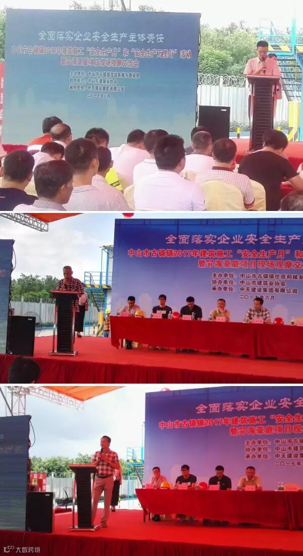 6月26日上午,中山市古镇镇2017年建筑施工“安全生产月”和“安全生产万里行”活动施工现场观摩会在古镇昇海豪庭项目举行(项目经理吴江锋、朱克成),该项目是中山分公司在古镇镇承接的第一个项目。中山市、古镇镇主管部门及镇区在建工程责任主体现场主要人员约200人参加了此次活动。本次活动由中山市横栏镇住房和城乡建设局主办,中山市建筑业协会协办,中天建设集团有限公司承办。
