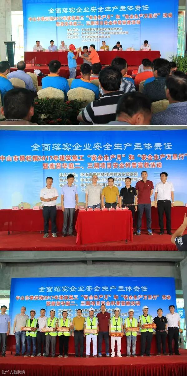 6月23日下午,中山市横栏镇2017年建筑施工“安全生产月”和“安全生产万里行”活动暨安全科普宣教活动在鹿茵华庭二、三期项目举行(项目经理包鹏斌)。中山市、横栏镇主管部门及镇区在建工程责任主体现场主要人员约200人参加了此次活动。本次活动由中山市横栏镇住房和城乡建设局主办,中山市建筑业协会协办,中天建设集团有限公司承办。