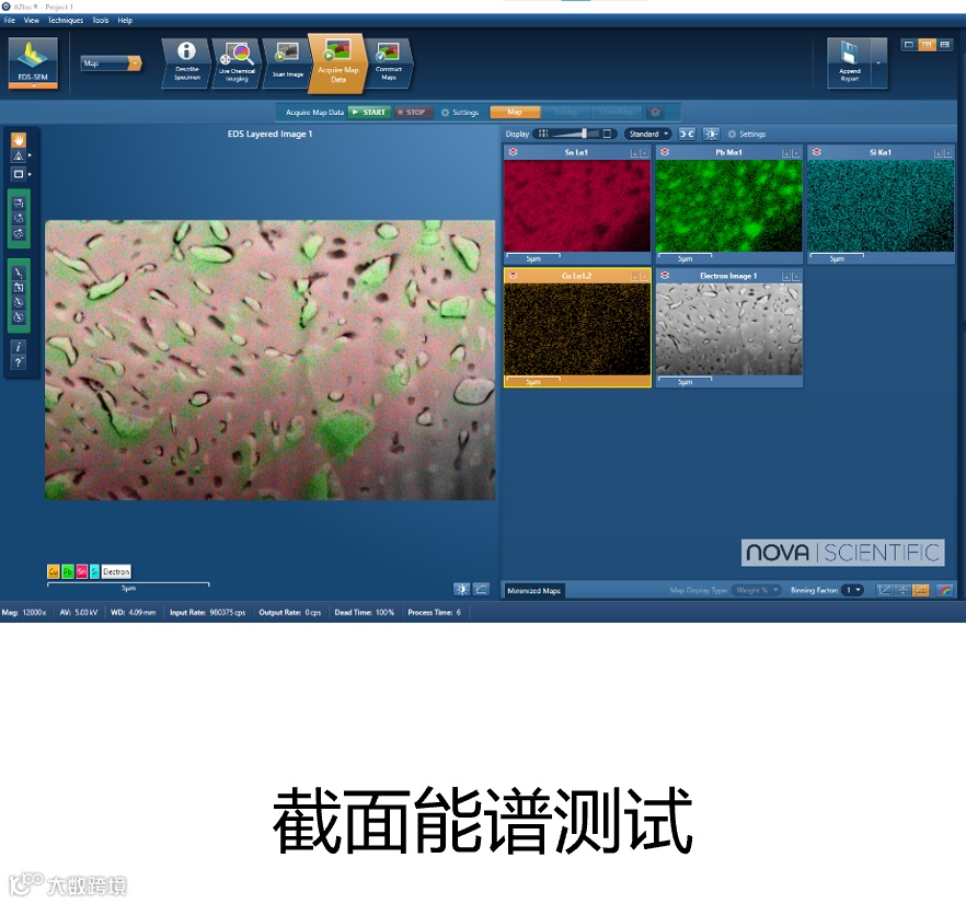 对材料截面进行表征分析,例如表征刨面结构形貌、测量各层尺寸厚度、能谱测试成分信息等