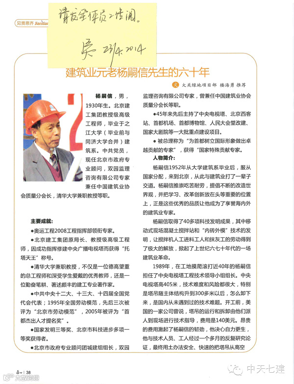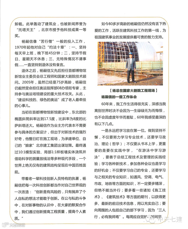 中天华南集团【导读】建筑元老杨嗣信,80多岁高龄,扎根建筑业60年,获得荣誉无数,从工地工人做到清华大学兼职教授!目前,他依然满怀热情,活跃在建筑科技工作的第一线,用实际行动践行着那不变的、珍贵的建筑哲理和智慧!(陈文华/文)