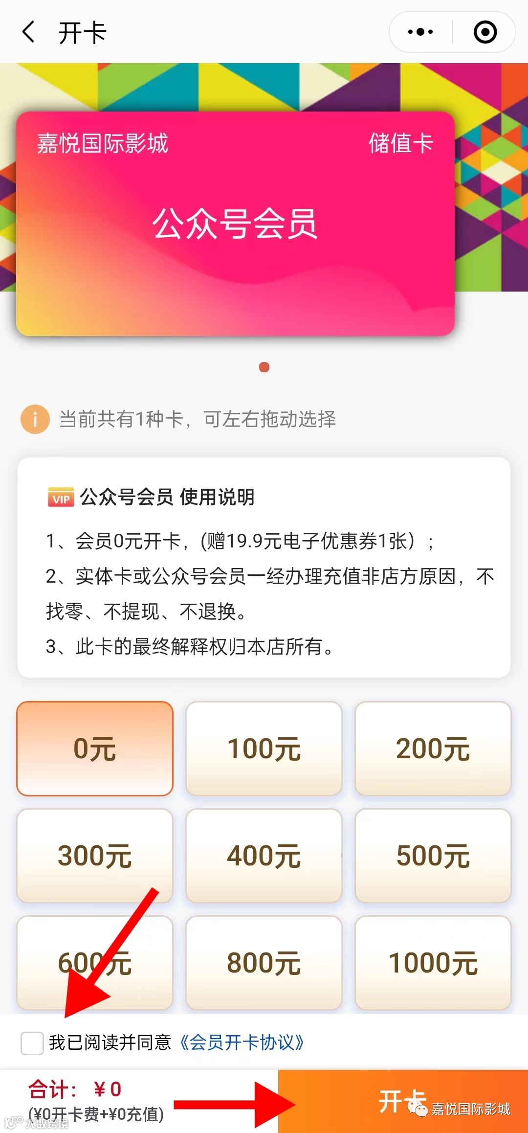 仔细阅读《会员开卡协议》并勾选同意-点击开卡