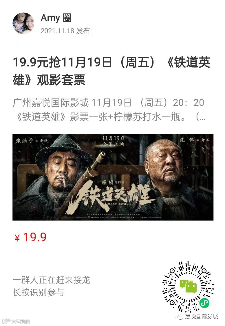 19.9元抢购11月19日《铁道英雄》观影套票!