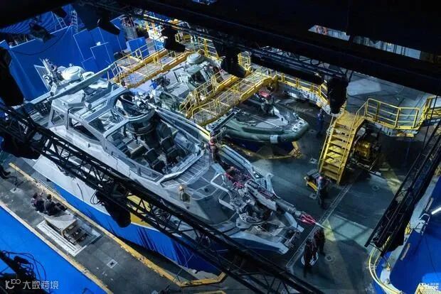 既然战场到了水底,人类的武器自然也要革新。此前,《阿凡达》系列制片人乔恩·兰道在社交媒体发图庆祝复工时,剧组搭建的庞大的指挥舰和骑士喷射艇也随之曝光。