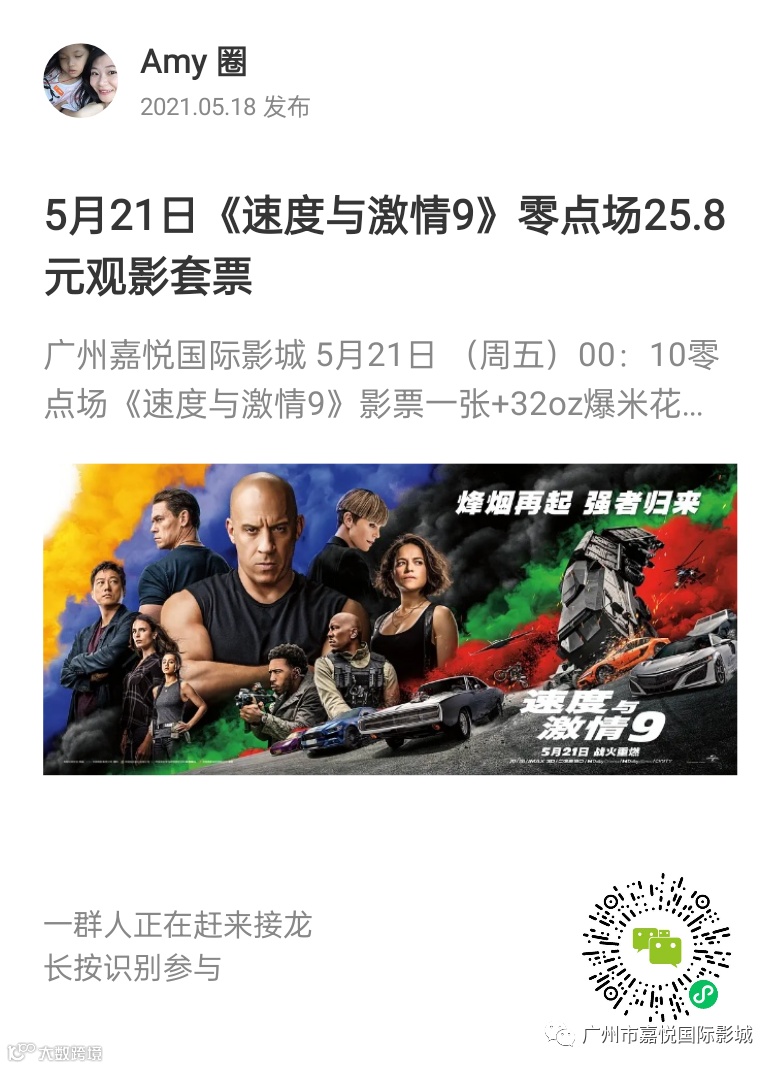 25.8元抢购5月21日《速度与激情9》零点场粉丝套票!