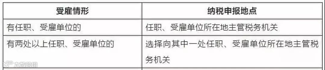 需要注意的是:需要办理汇算清缴的纳税人,应当在取得所得的次年3月1日至6月30日内,向任职、受雇单位所在地主管税务机关办理纳税申报,并报送《个人所得税年度自行纳税申报表》。纳税人有两处以上任职、受雇单位的,选择向其中一处任职、受雇单位所在地主管税务机关办理纳税申报;纳税人没有任职、受雇单位的,向户籍所在地或经常居住地主管税务机关办理纳税申报。