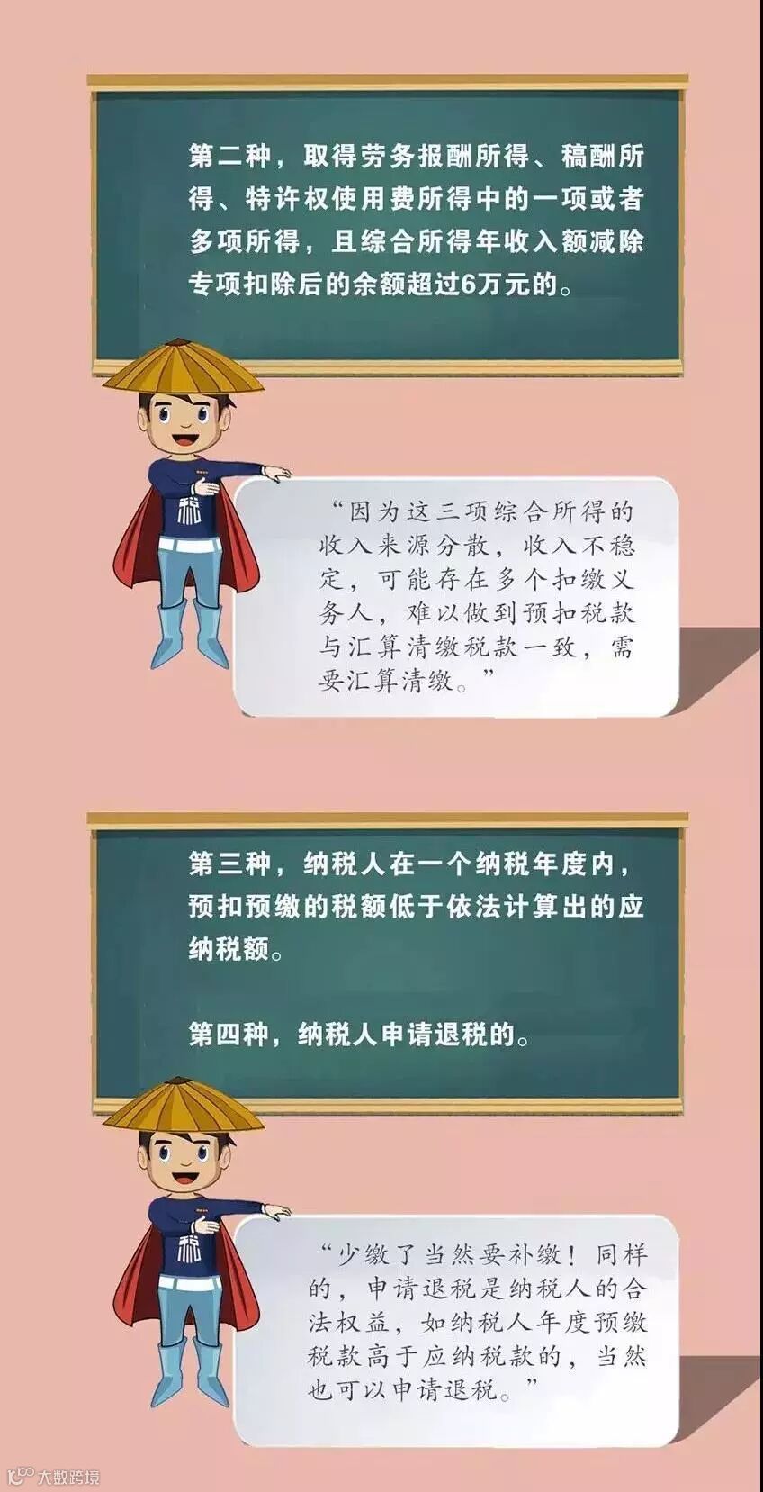 参考依据:《国家税务总局关于个人所得税自行纳税申报有关问题的公告》国家税务总局公告2018年第62号规定“取得综合所得且符合下列情形之一的纳税人,应当依法办理汇算清缴: